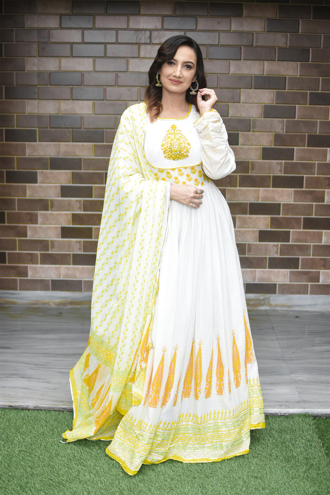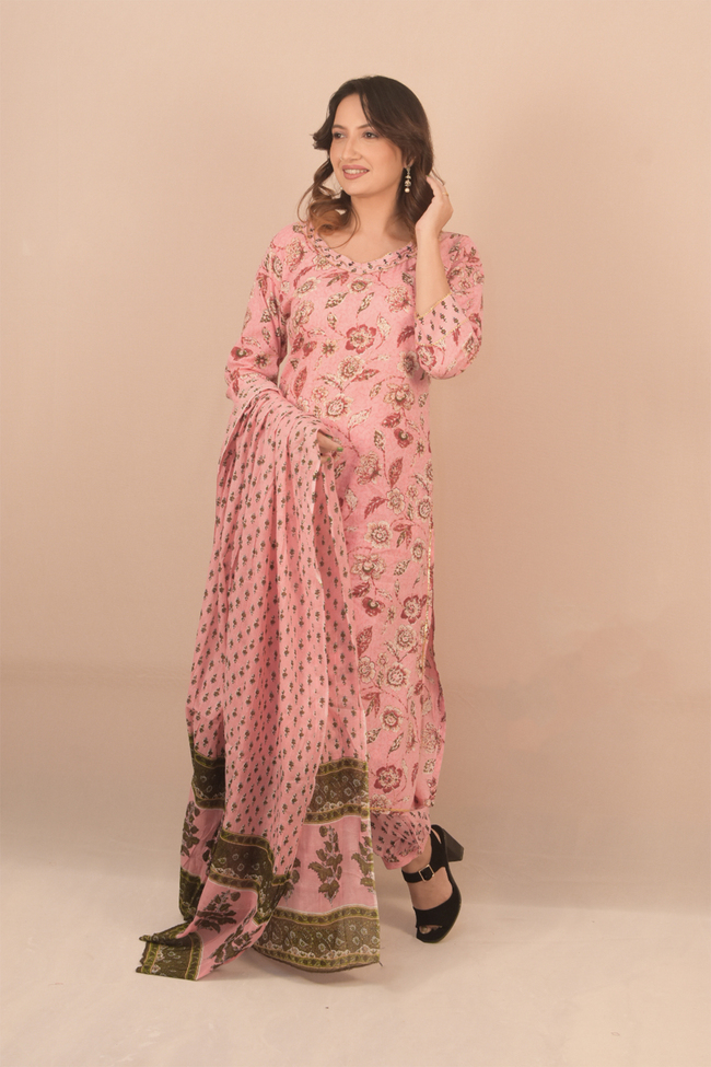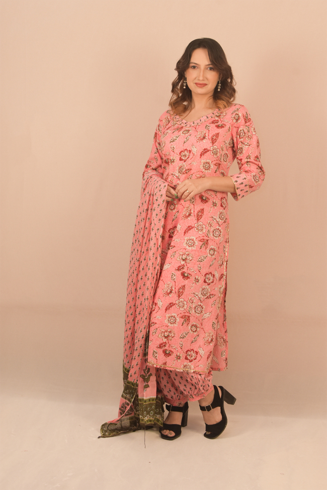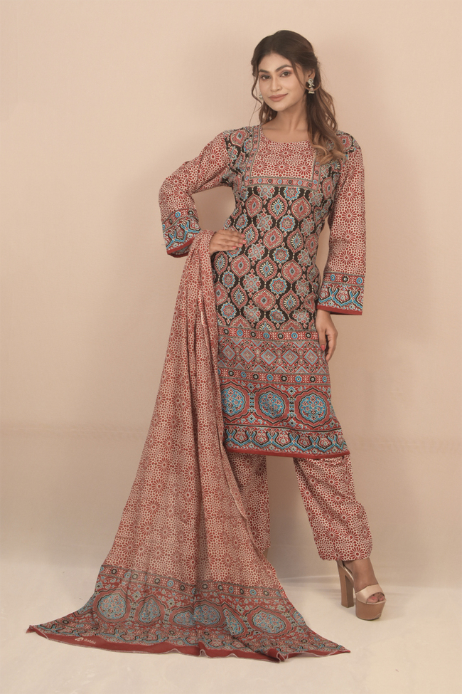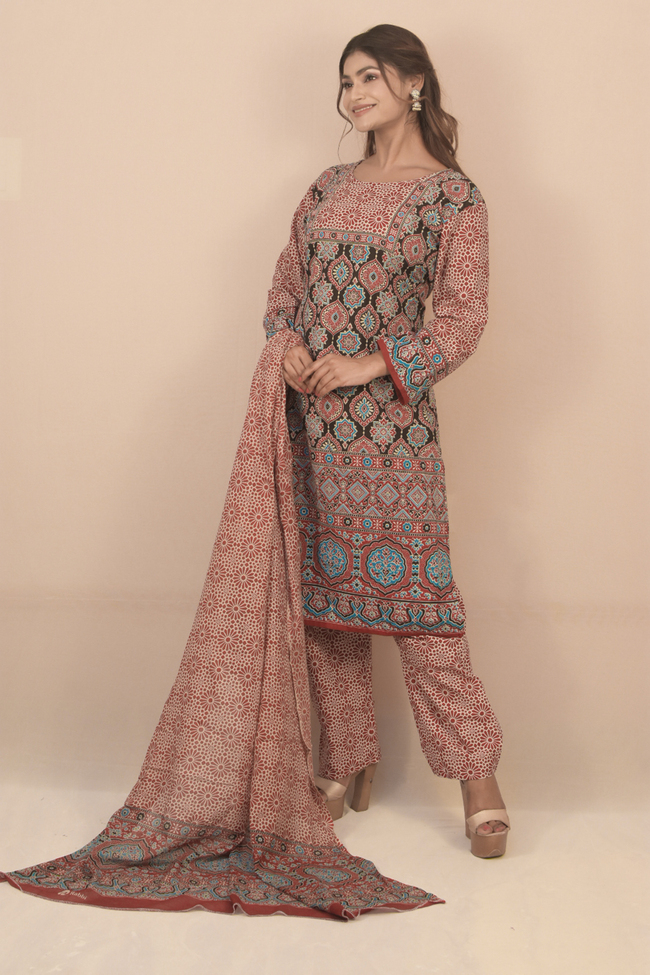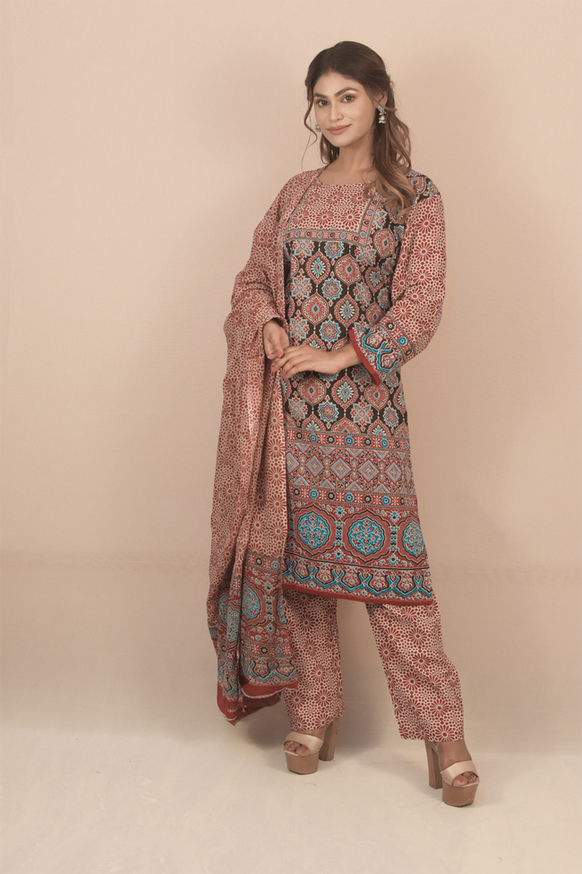 Bandni Print, Havey Rayon, set of three, Nyra cut round neck, front embroidery work, straight pants, full-length dupatta